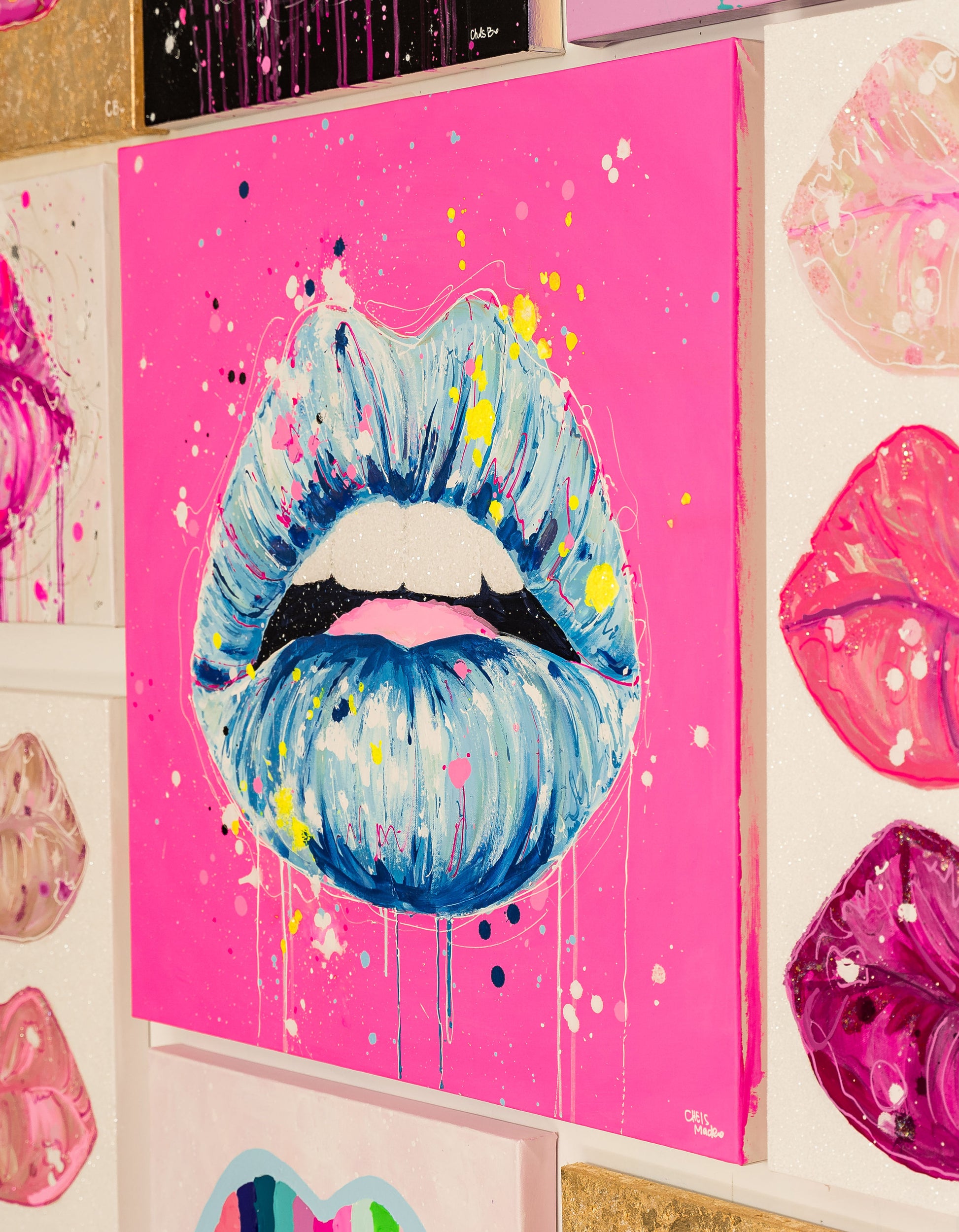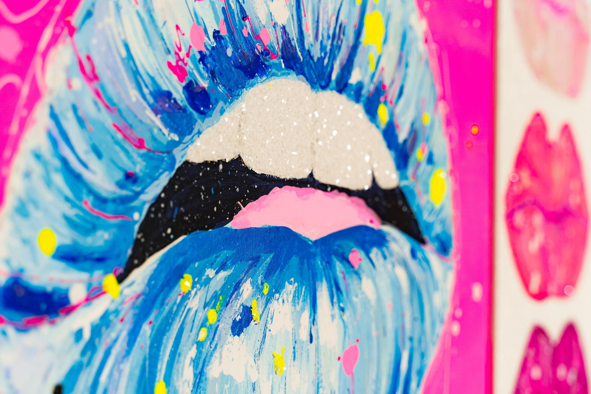 Well, like a boss, this painting deserves to be centered in an office. With bold colors and splattered paint to bring excitement, this painting is one for the books. Done on a large canvas, the glittered teeth are displayed brilliantly. It's hard to not be a fan!