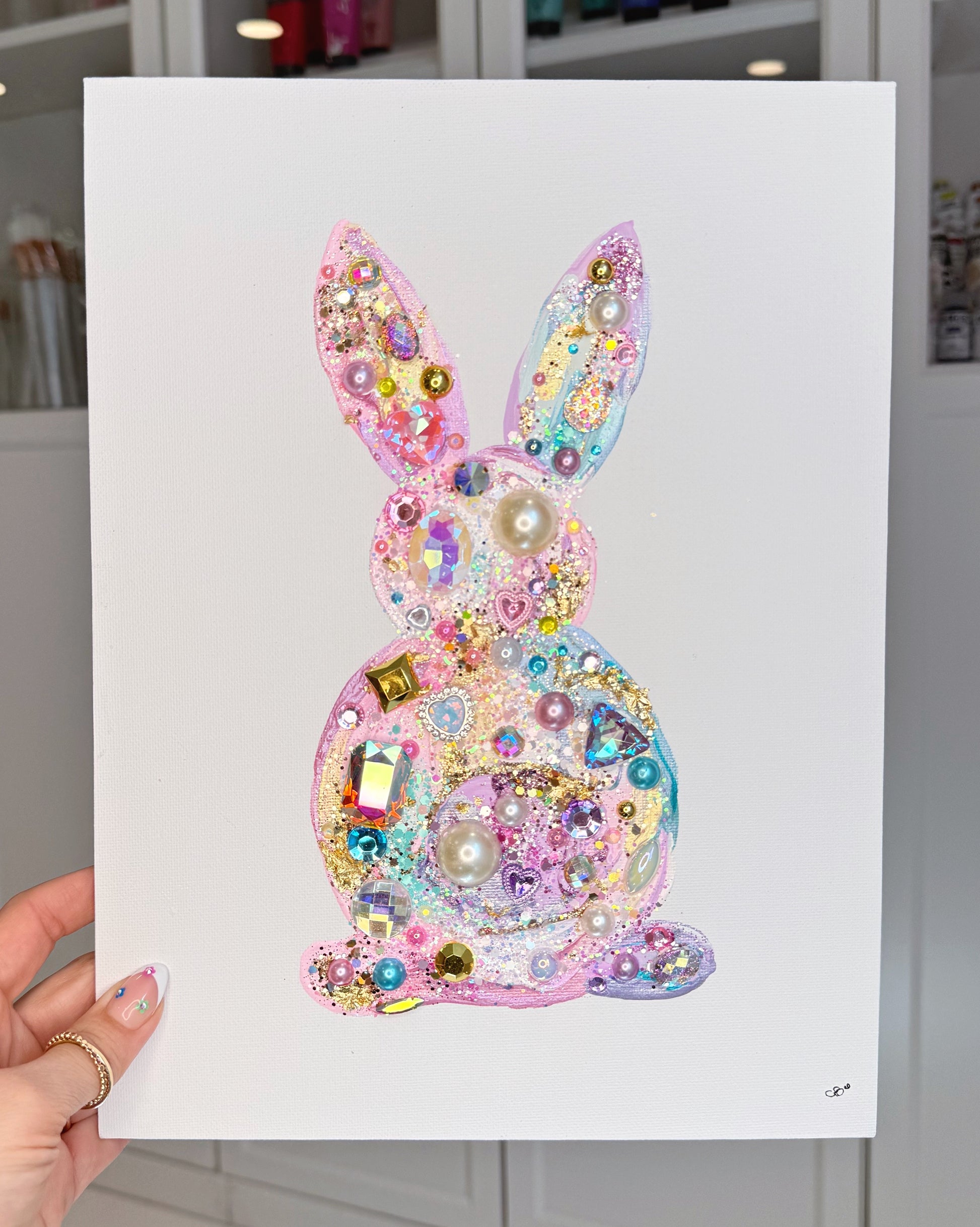Bring charm, sparkle, and sweetness into your home with this one of a kind bunny, a delightful mixed media artwork bursting with personality. This handcrafted piece features a playful bunny silhouette brought to life with layers of glitter, rhinestones, pearls, and iridescent gems.