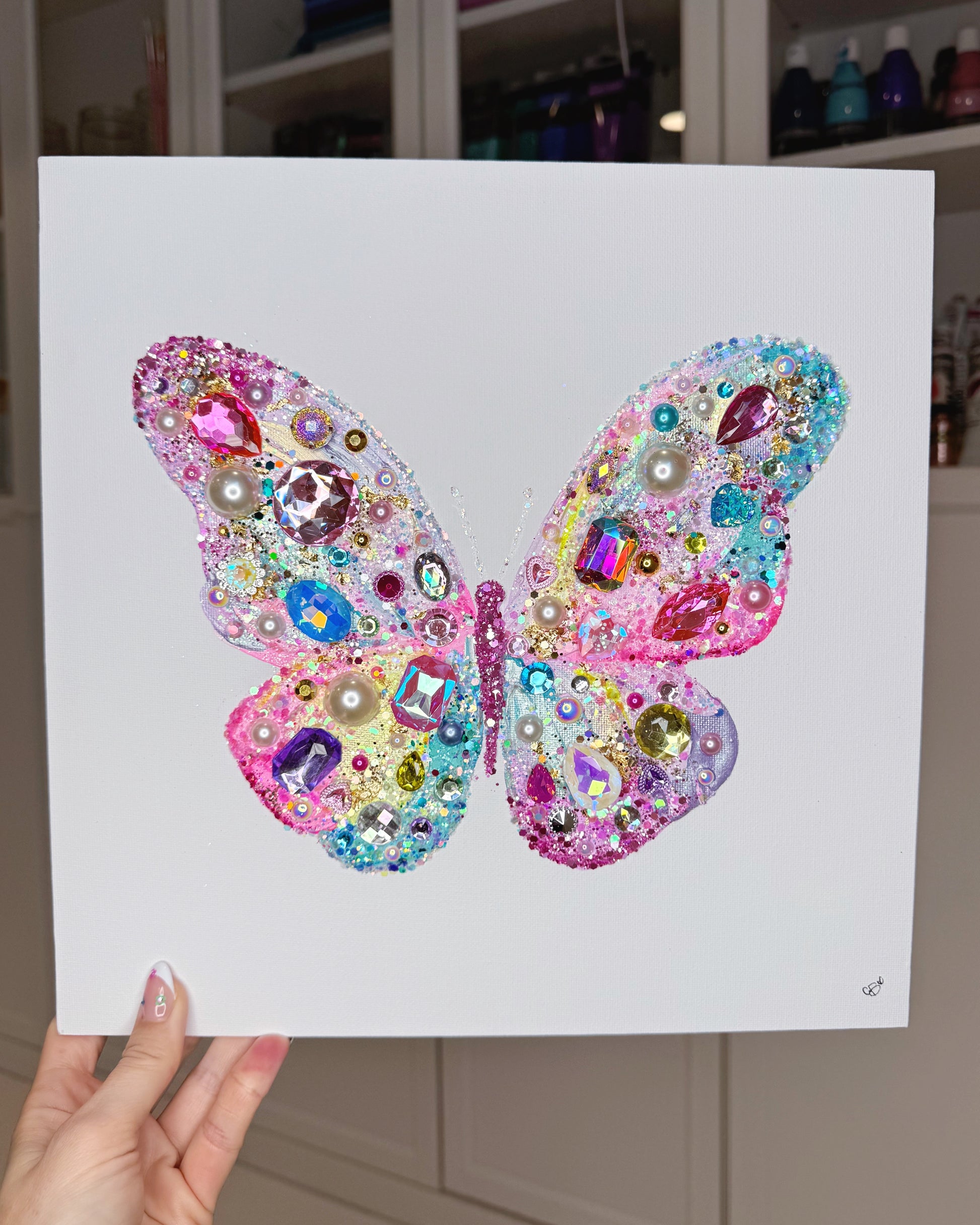 Let your imagination take flight with this one of a kind Chels Made Butterfly, a stunning mixed media artwork that brings the magic of transformation to life. This vibrant butterfly is handcrafted with a kaleidoscope of colorful gems, pearls, and rhinestones, set against a backdrop of shimmering glitter and pastel hues.