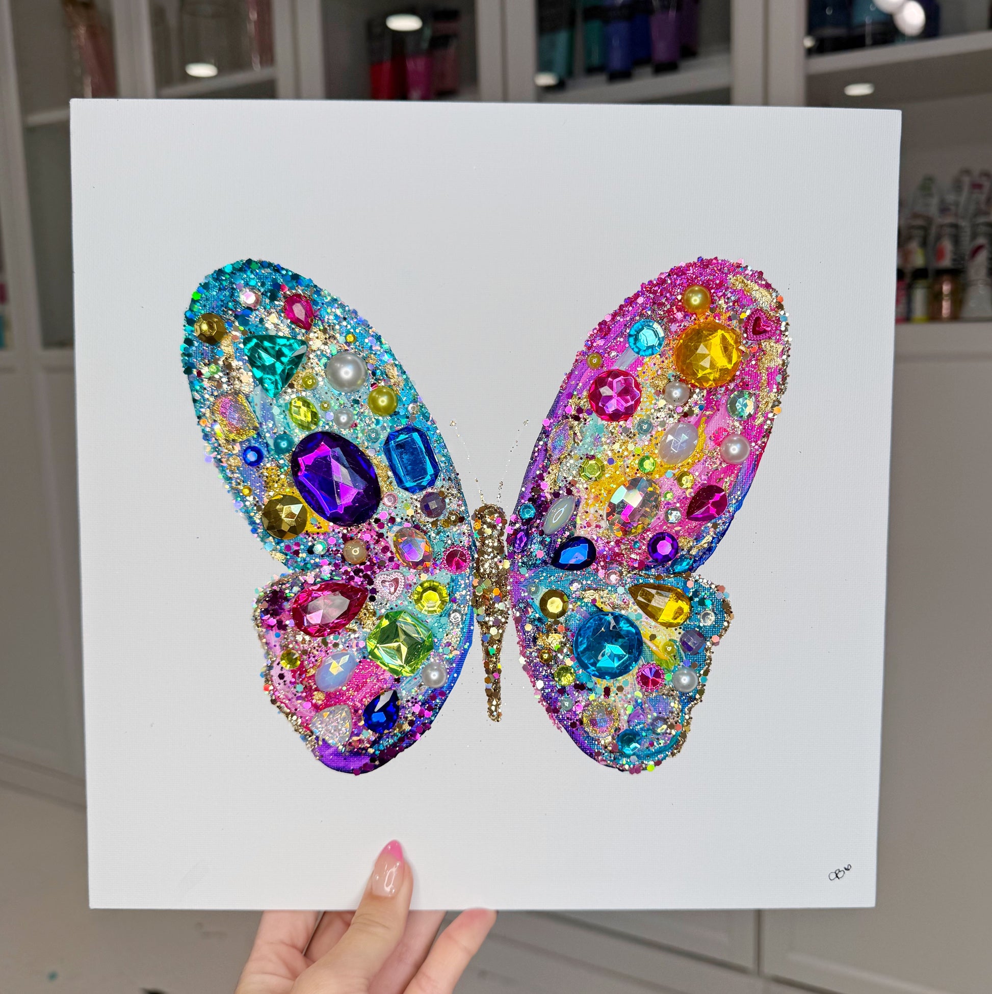 Add sparkle and joy to your space with this magical butterfly. This dazzling butterfly bursts to life with an array of vibrant, multicolored gemstones, pearls, and glitter, each carefully placed to create a sense of motion, magic, and transformation. Set against a clean white canvas, the vivid colors and glitters shimmer under light, making this piece a radiant focal point in any room.