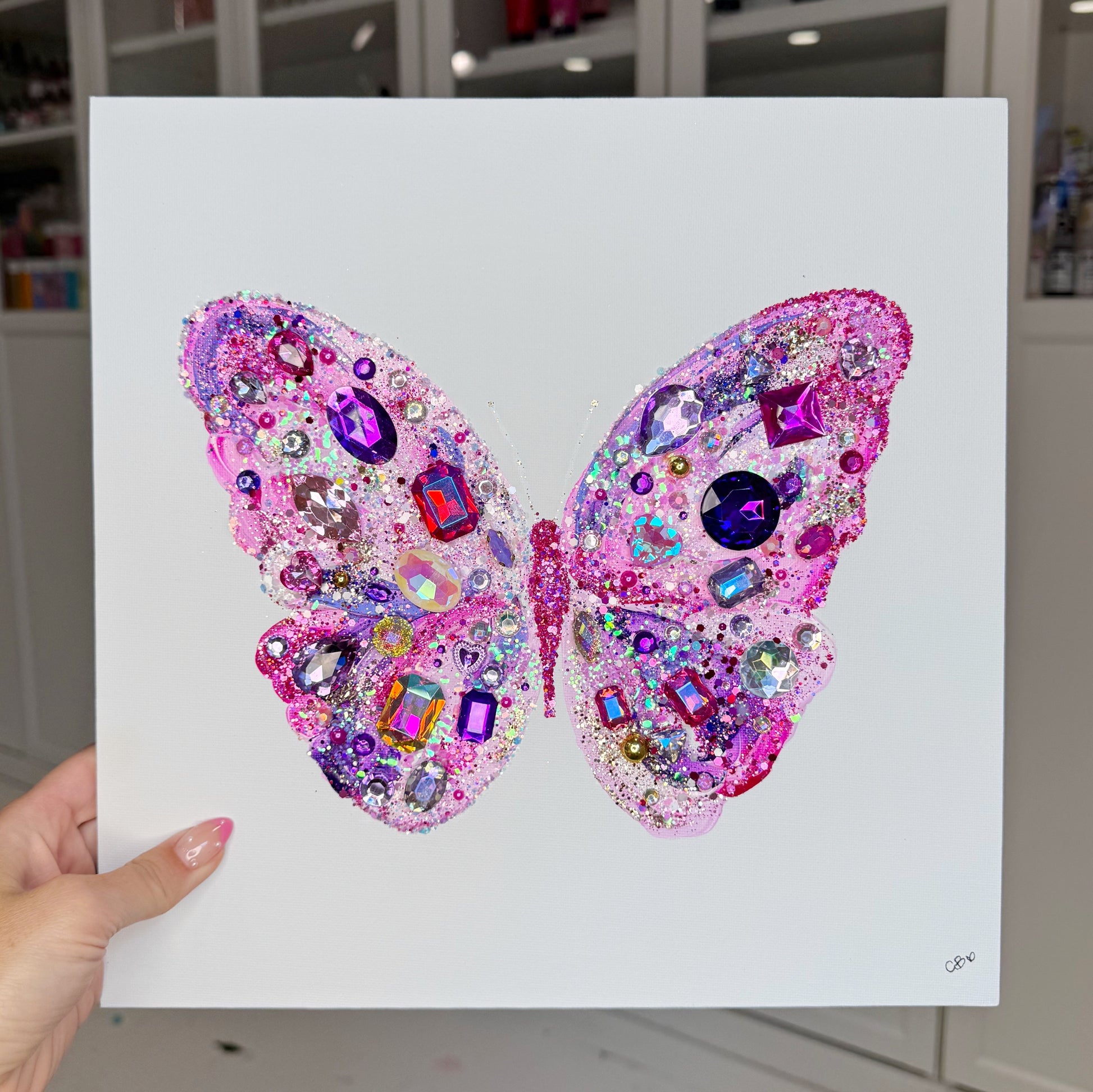 Add sparkle and joy to your space with this magical butterfly. This dazzling butterfly bursts to life with an array of vibrant, multicolored gemstones, pearls, and glitter, each carefully placed to create a sense of motion, magic, and transformation. Set against a clean white canvas, the vivid colors and glitters shimmer under light, making this piece a radiant focal point in any room.