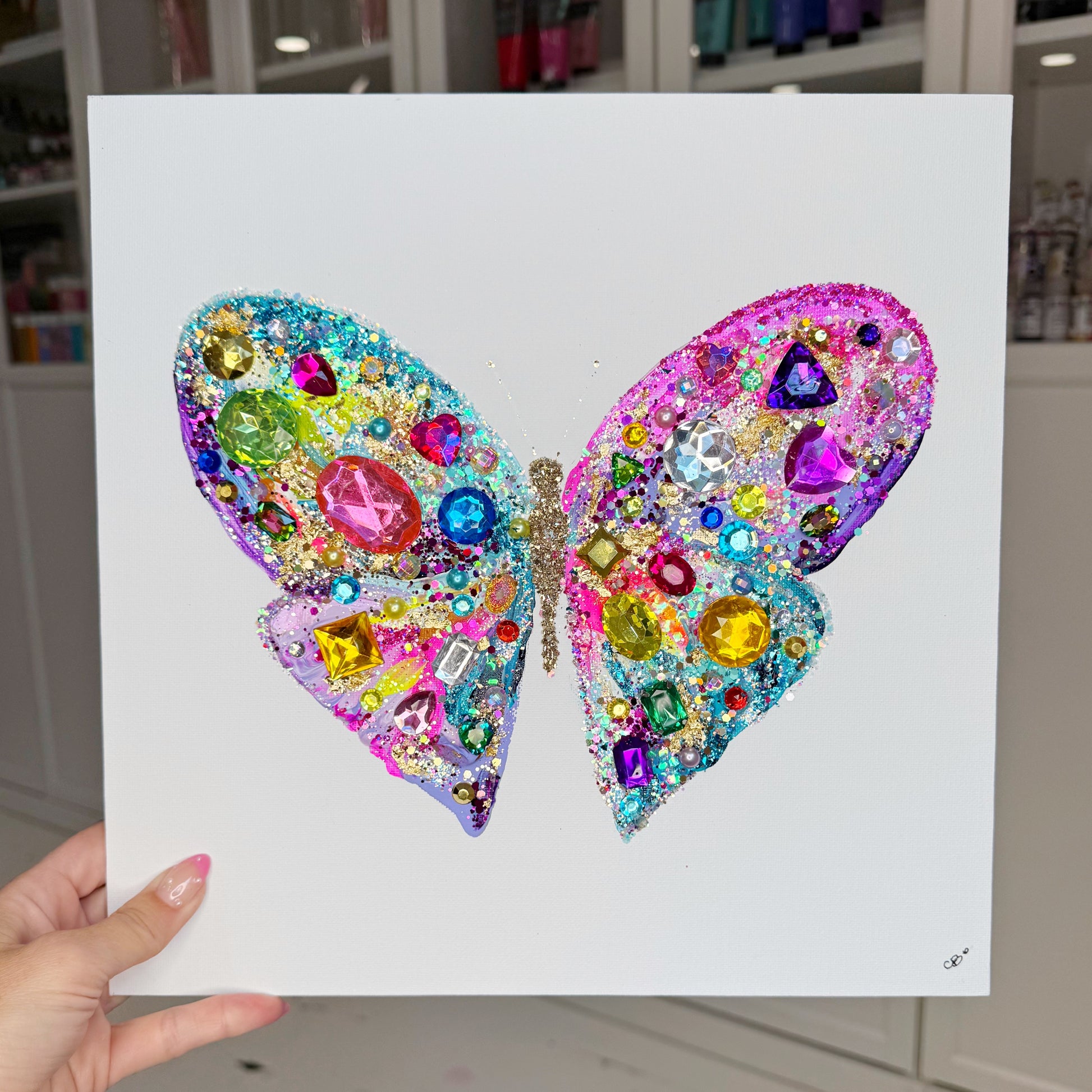 Add sparkle and joy to your space with this magical butterfly. This dazzling butterfly bursts to life with an array of vibrant, multicolored gemstones, pearls, and glitter, each carefully placed to create a sense of motion, magic, and transformation. Set against a clean white canvas, the vivid colors and glitters shimmer under light, making this piece a radiant focal point in any room.