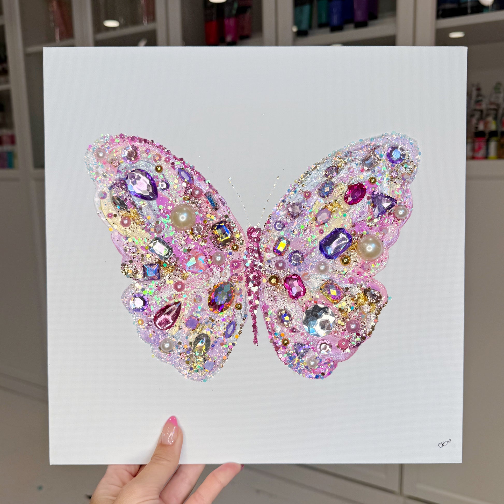 Add sparkle and joy to your space with this magical butterfly. This dazzling butterfly bursts to life with an array of vibrant, multicolored gemstones, pearls, and glitter, each carefully placed to create a sense of motion, magic, and transformation. Set against a clean white canvas, the vivid colors and glitters shimmer under light, making this piece a radiant focal point in any room.