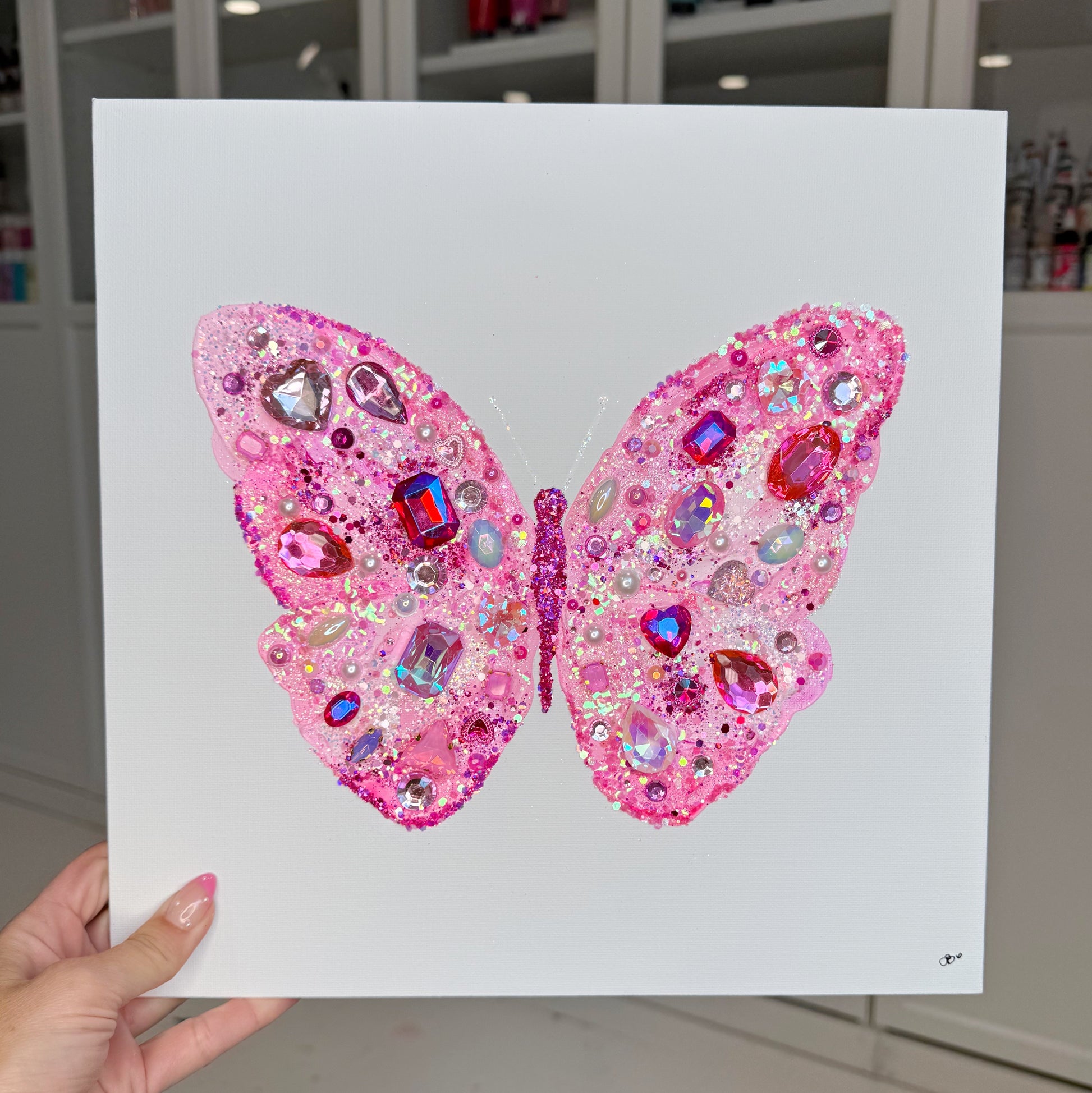 Add sparkle and joy to your space with this magical butterfly. This dazzling butterfly bursts to life with an array of vibrant, multicolored gemstones, pearls, and glitter, each carefully placed to create a sense of motion, magic, and transformation. Set against a clean white canvas, the vivid colors and glitters shimmer under light, making this piece a radiant focal point in any room.