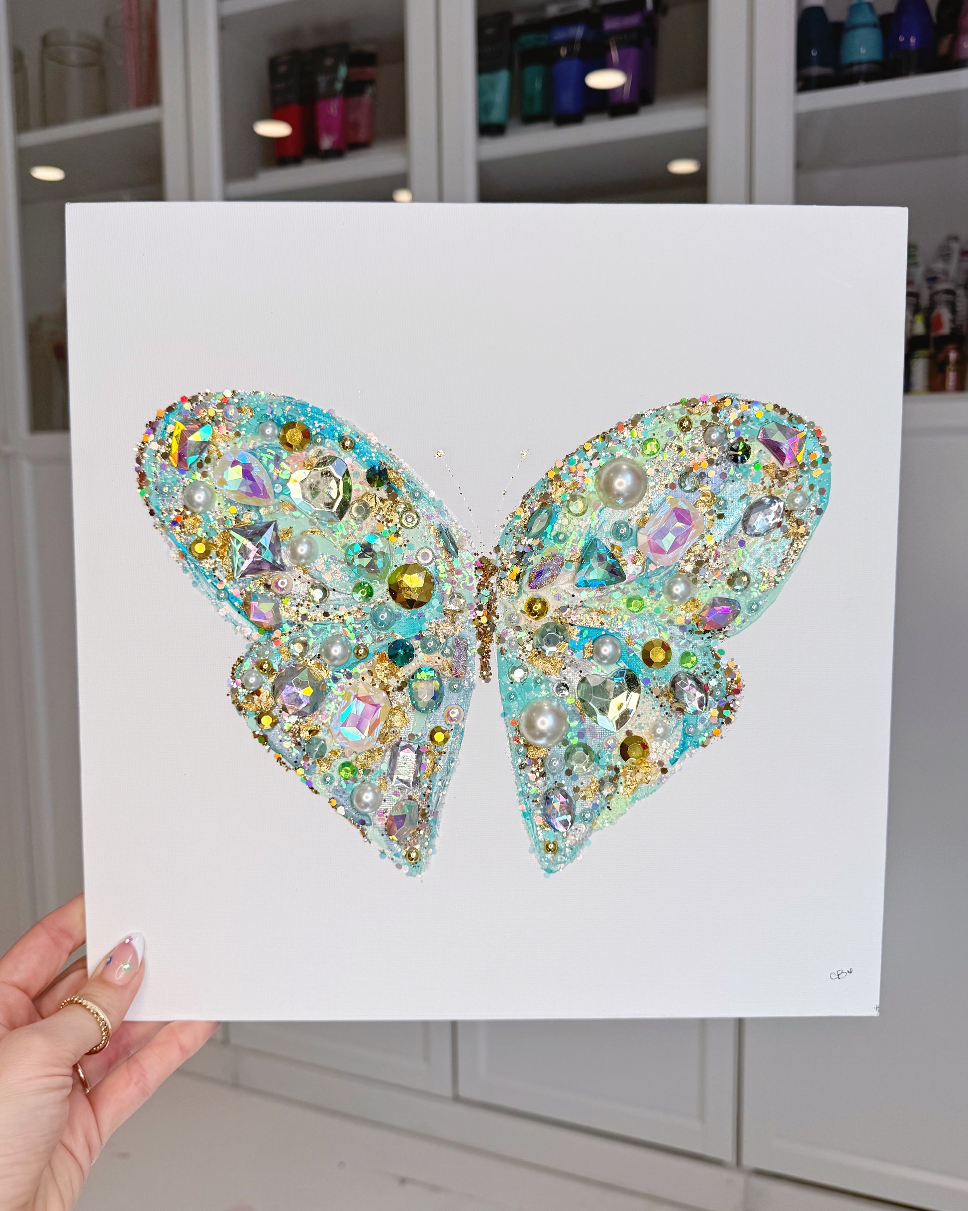 Let your imagination take flight with this one of a kind Chels Made Butterfly, a stunning mixed media artwork that brings the magic of transformation to life. This vibrant butterfly is handcrafted with a kaleidoscope of colorful gems, pearls, and rhinestones, set against a backdrop of shimmering glitter and pastel hues.