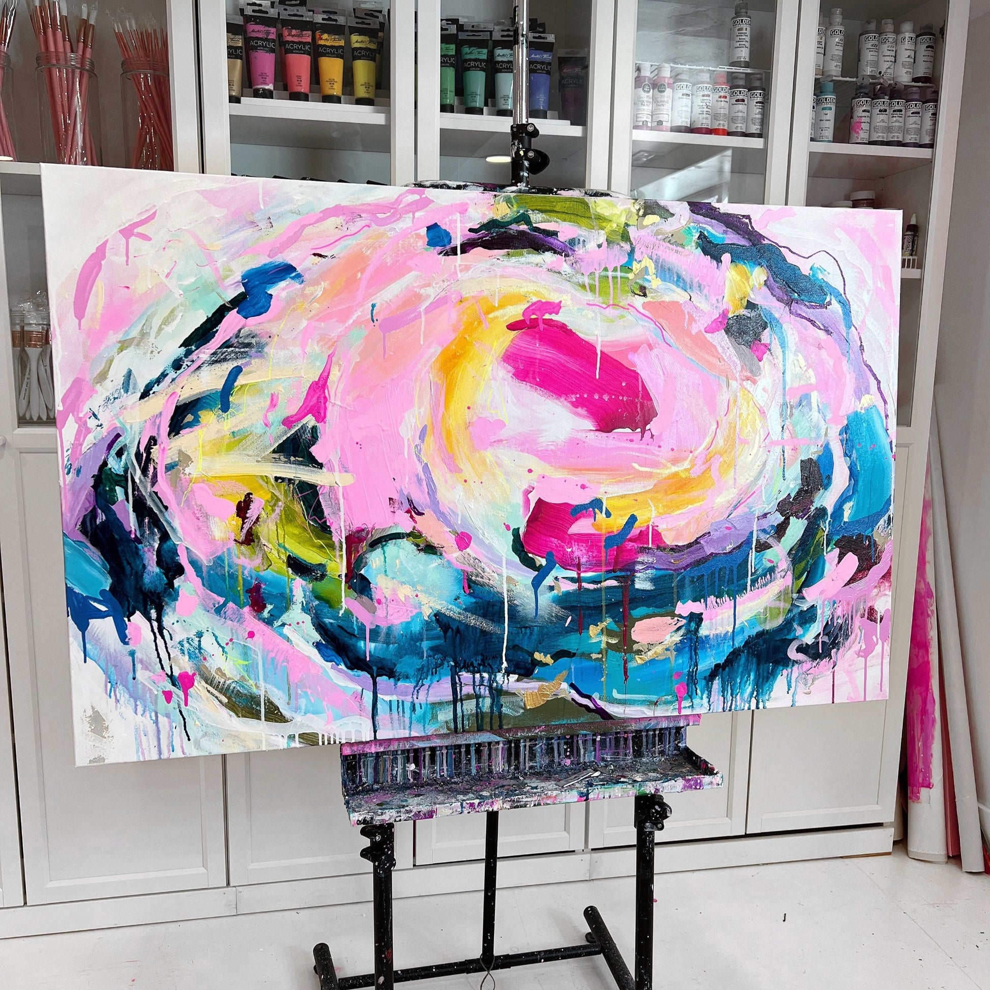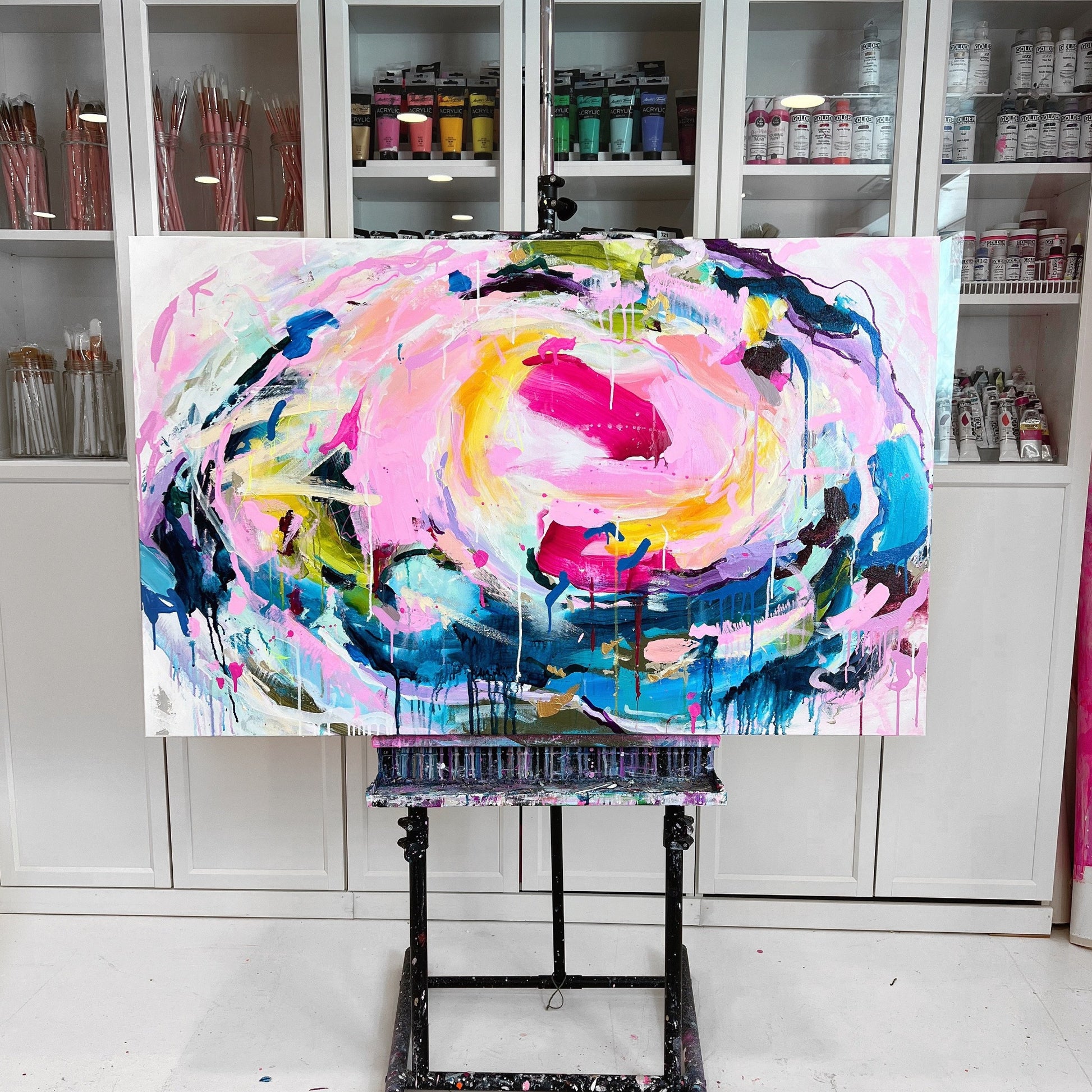 'Chasing Chaos' beautifully exhibits passion, abstraction, and color. It's a love for putting a fresh spin on the chaos of life. The playing of bright colors and paint strokes in this piece transforms any room. With the light pinks and blues, it's both chaotic and subtle - giving you a fun new way to chase chaos while creating harmony in your space.