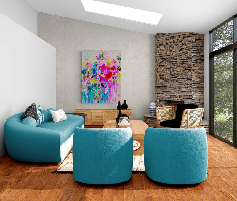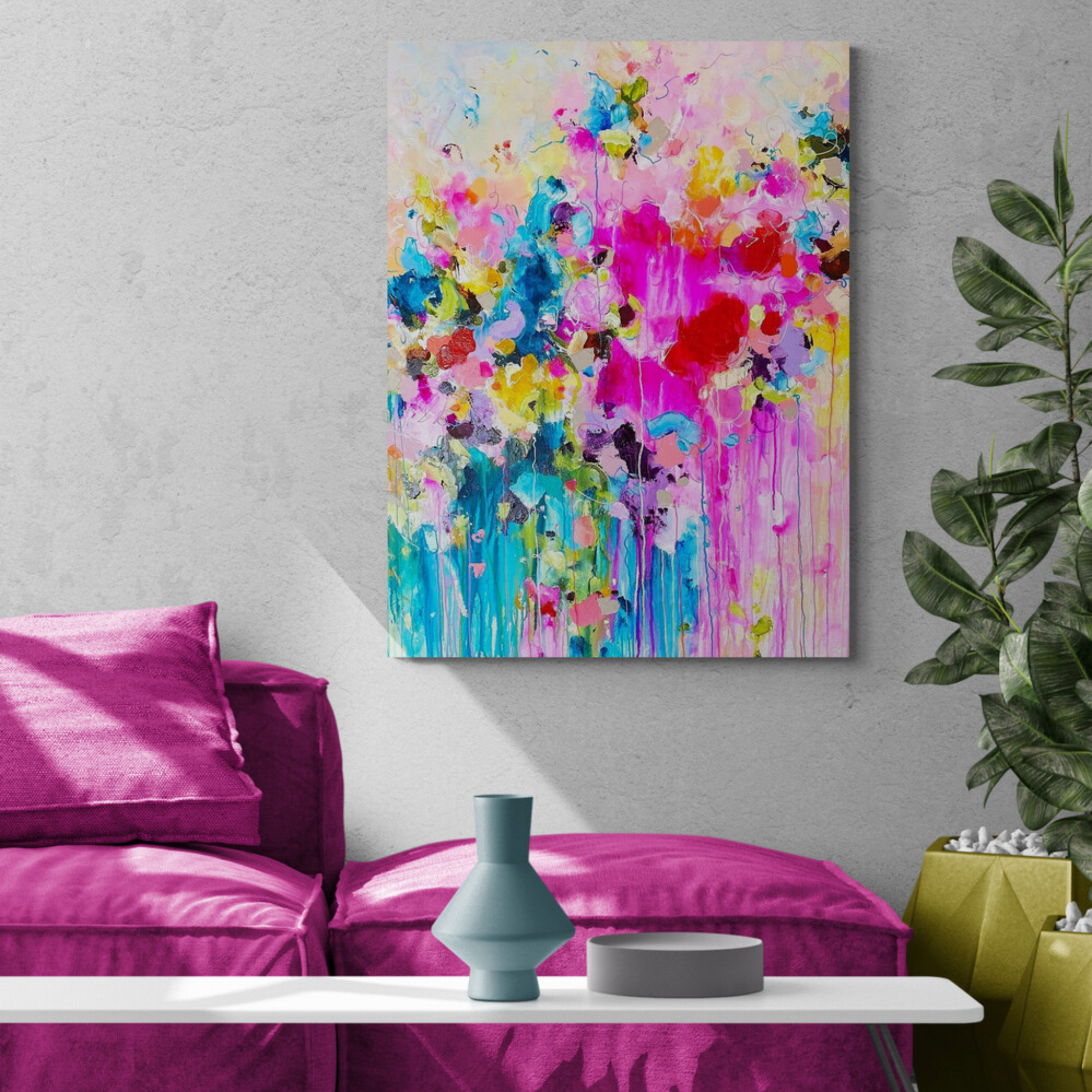 From the artist's studio, this original acrylic painting is a beautiful representation of the bright pink and blue flowers that are so popular right now. The drips of paint make it a fun piece, while the modern flowers give it a fresh and lively feel. This painting would be the perfect pop of color for any room in your home!