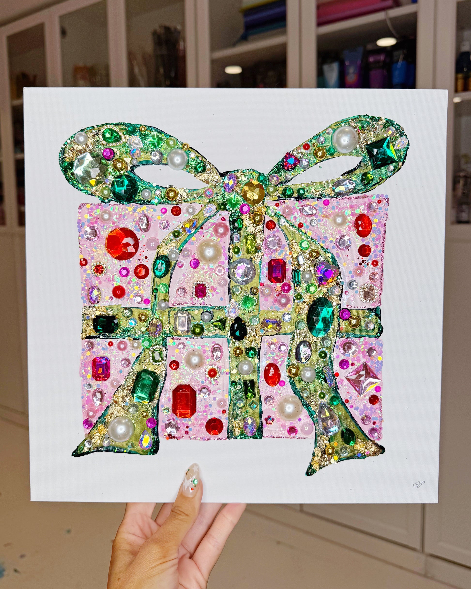 This jeweled Christmas gift is full of sparkle, color, and festive charm. Covered in bright gems, pearls and shimmering details, it catches the light beautifully and adds the perfect pop of holiday magic. These jeweled paintings go viral on TikTok and Instagram every year!