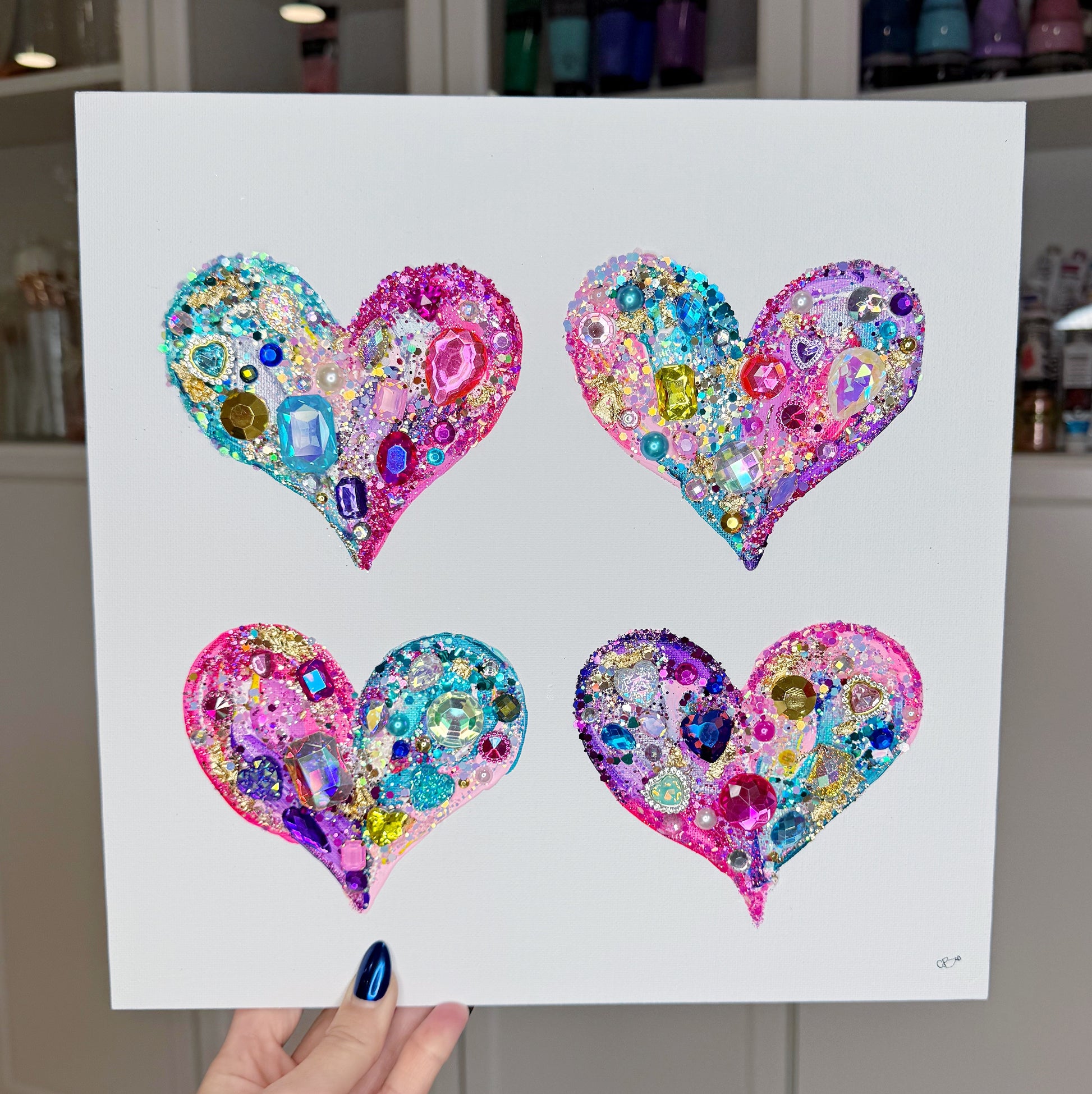 Say hello to our bedazzled one of a kind Valentine Hearts!! Each one is made with acrylic paint, glitter, jewels and a whole lotta love! Don’t miss your favorite!!