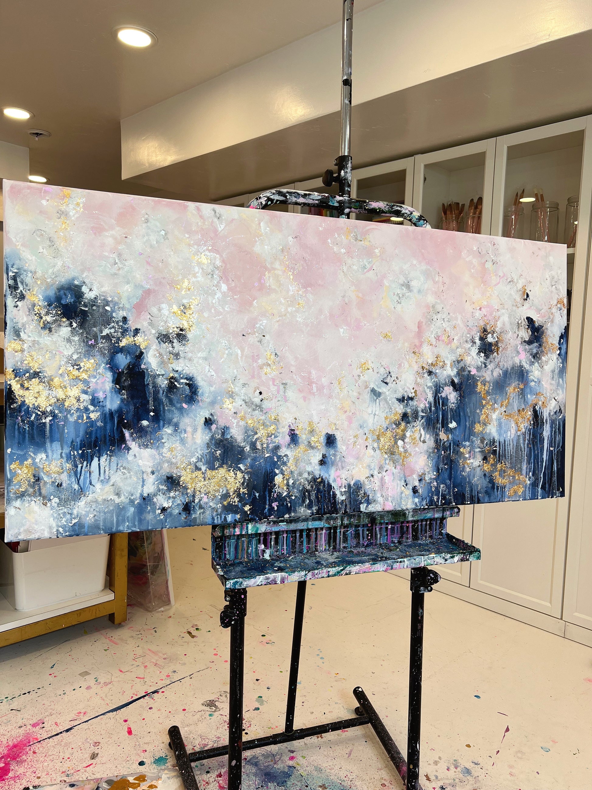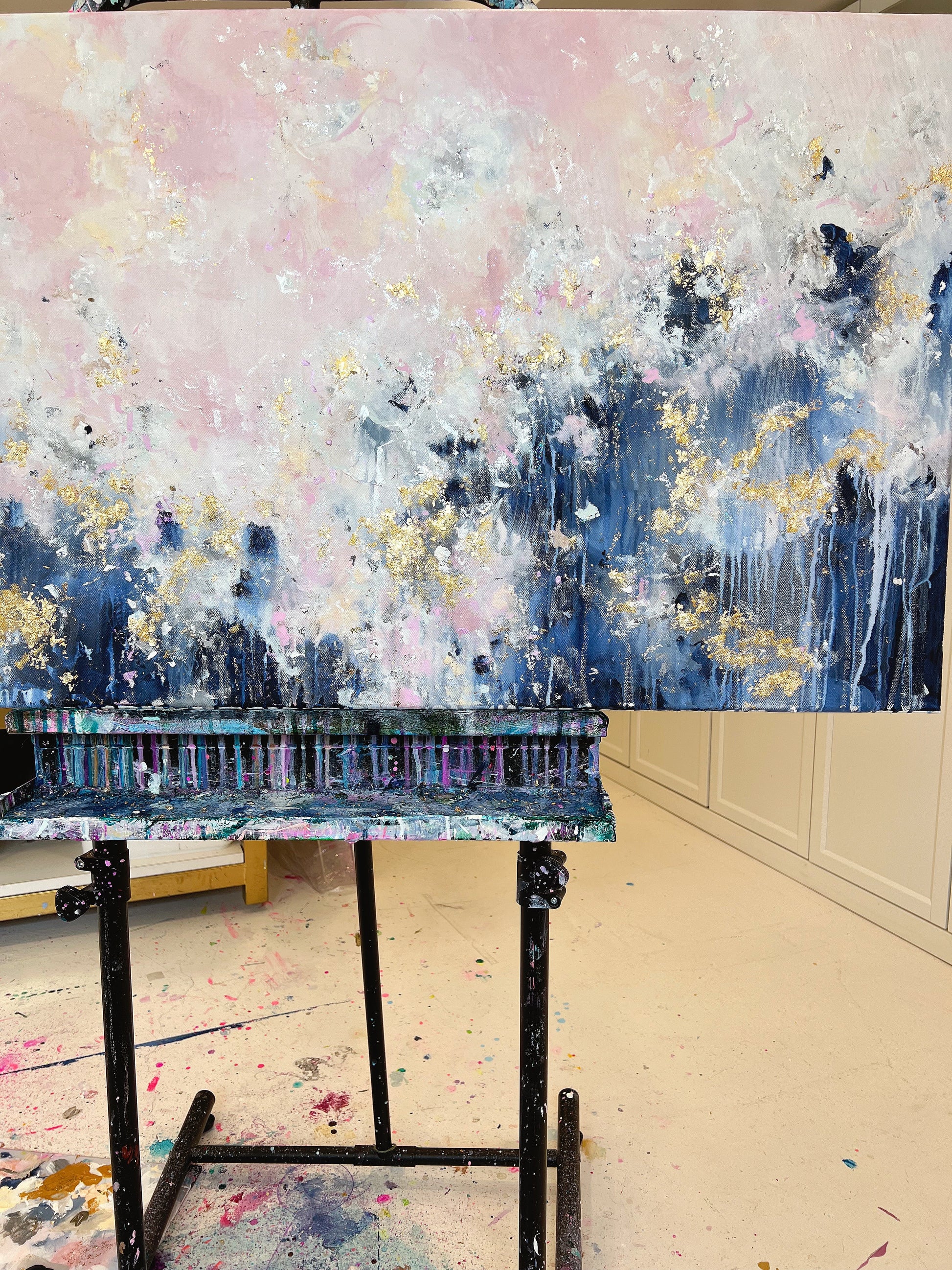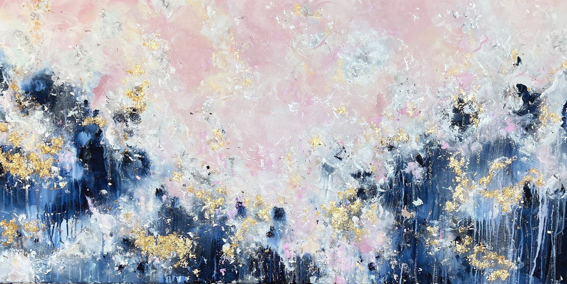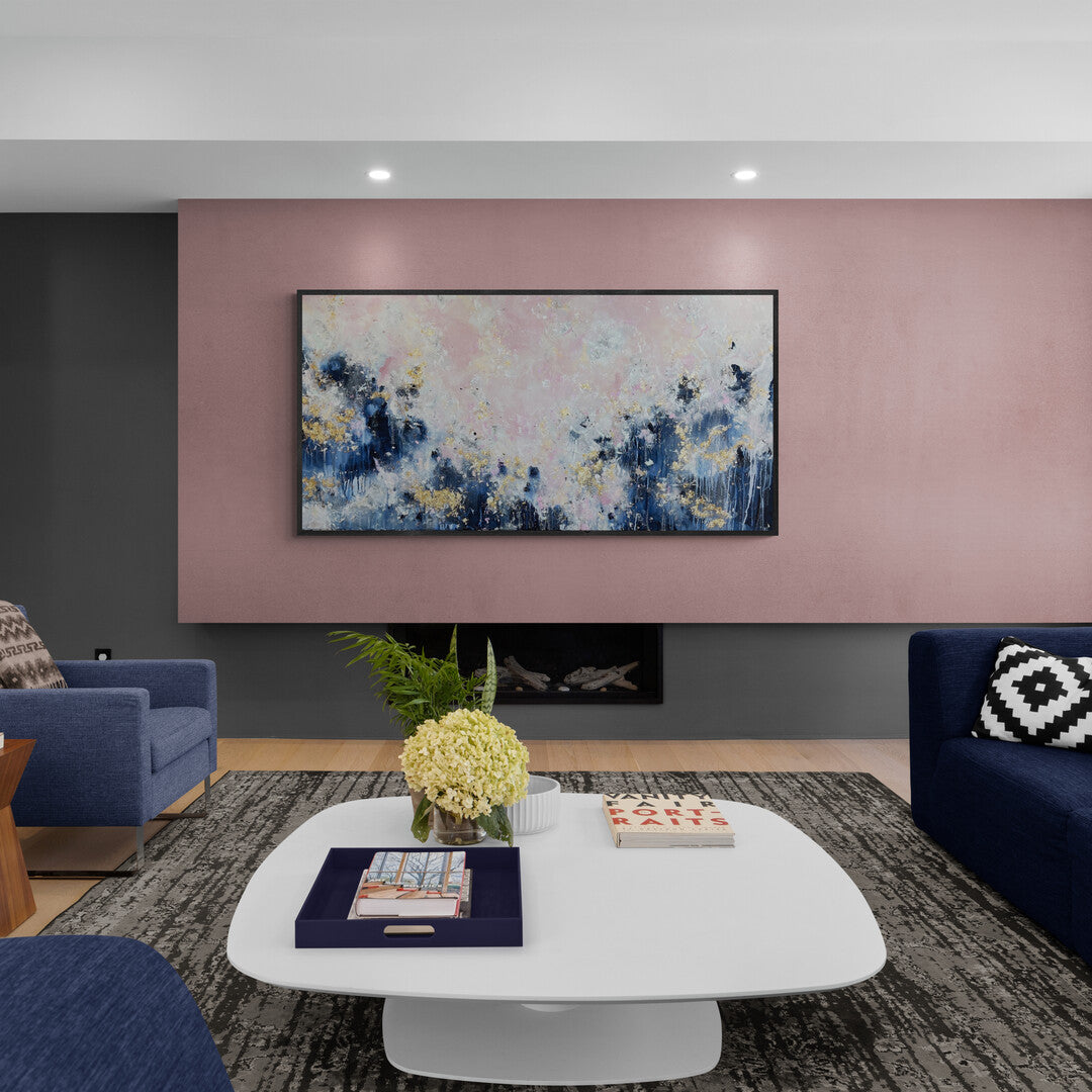 Add a unique and stunning touch to your home with Still Learning To Love! This breathtaking acrylic painting features light, fluffy pink clouds and a deep, dark blue contrast at the bottom, all decorated with gold leafing for an elegant finish. Put it up in your living room or bedroom to instantly improve the ambiance of any space. Invest in this stunning piece today and give yourself a visual reminder to love life!