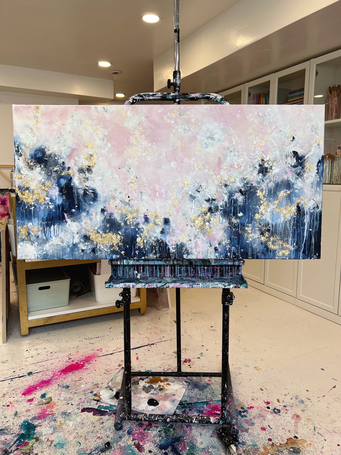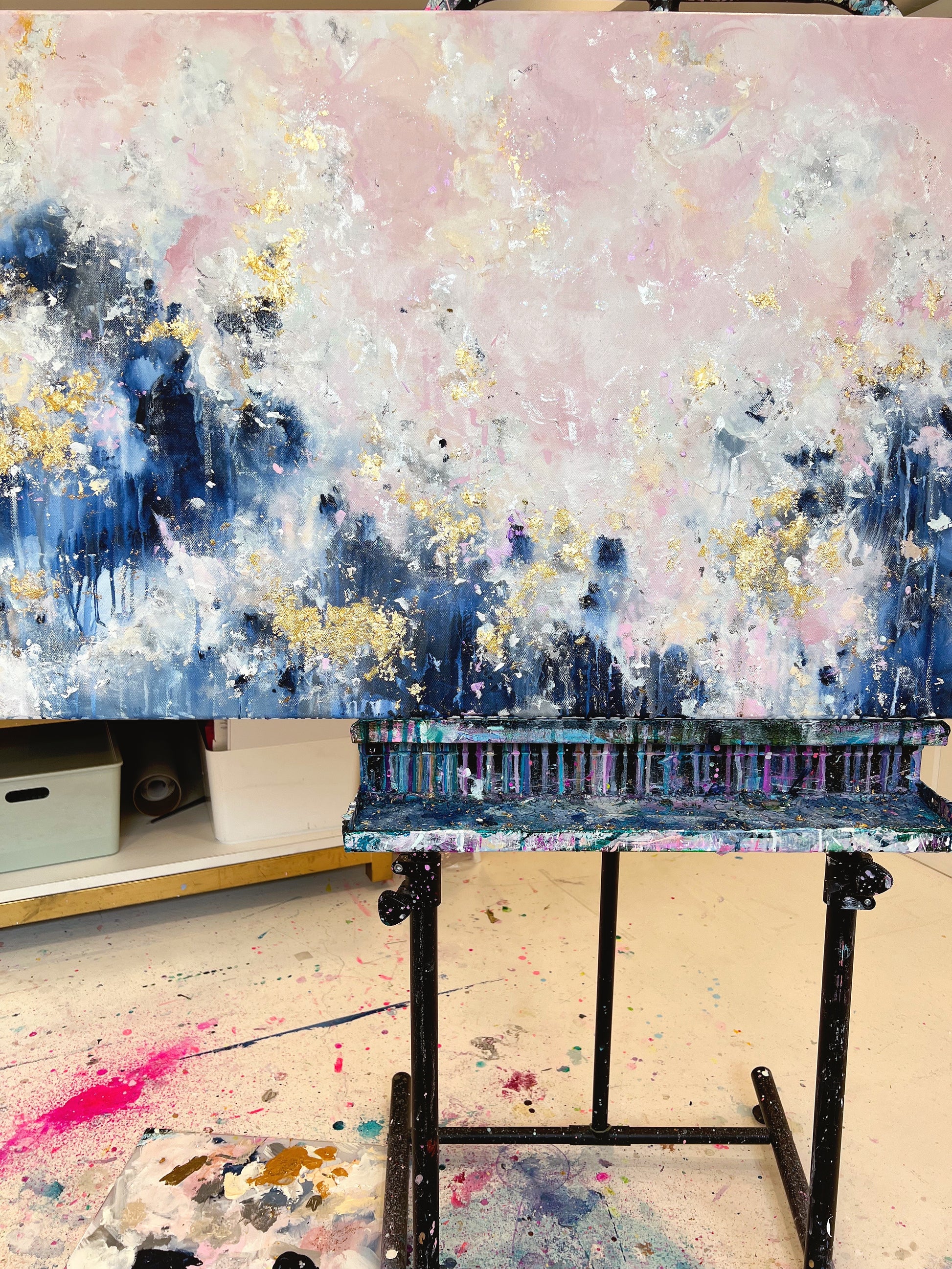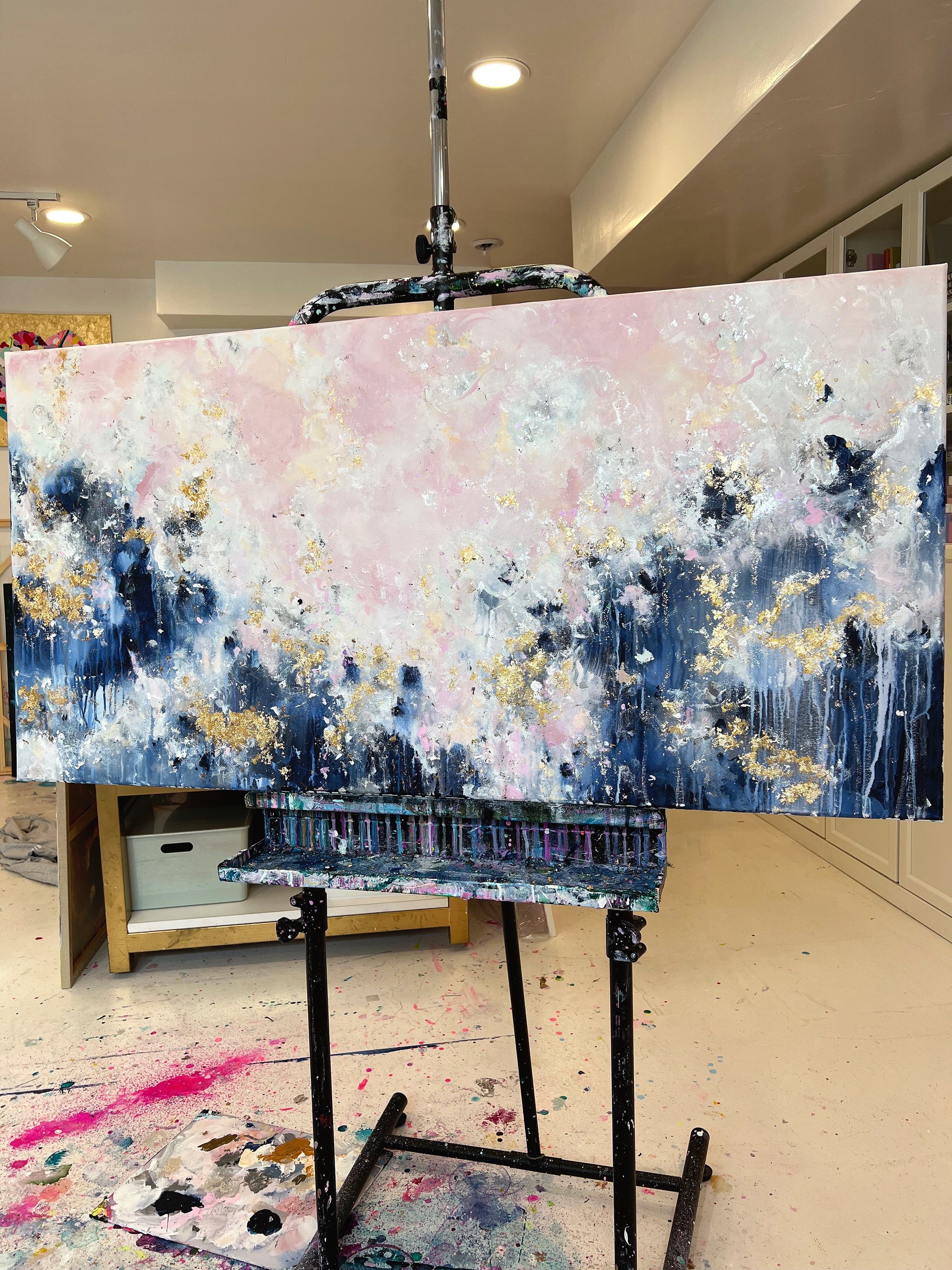 Add a unique and stunning touch to your home with Still Learning To Love! This breathtaking acrylic painting features light, fluffy pink clouds and a deep, dark blue contrast at the bottom, all decorated with gold leafing for an elegant finish. Put it up in your living room or bedroom to instantly improve the ambiance of any space. Invest in this stunning piece today and give yourself a visual reminder to love life!