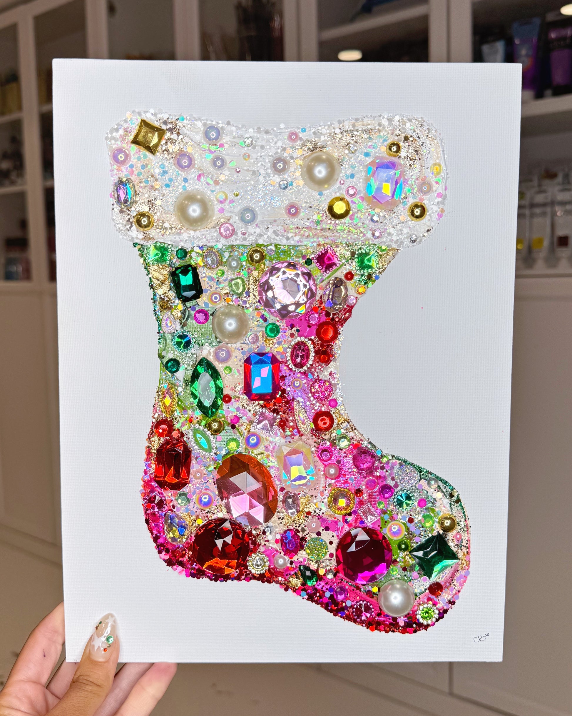 This sparkling jeweled stocking is packed with festive color, shimmer, and texture. Covered in rainbow gems, pearls, and hand-painted details, it catches the light beautifully and brings a bold pop of Christmas magic to any space. These jeweled pieces go viral on TikTok and Instagram every year!