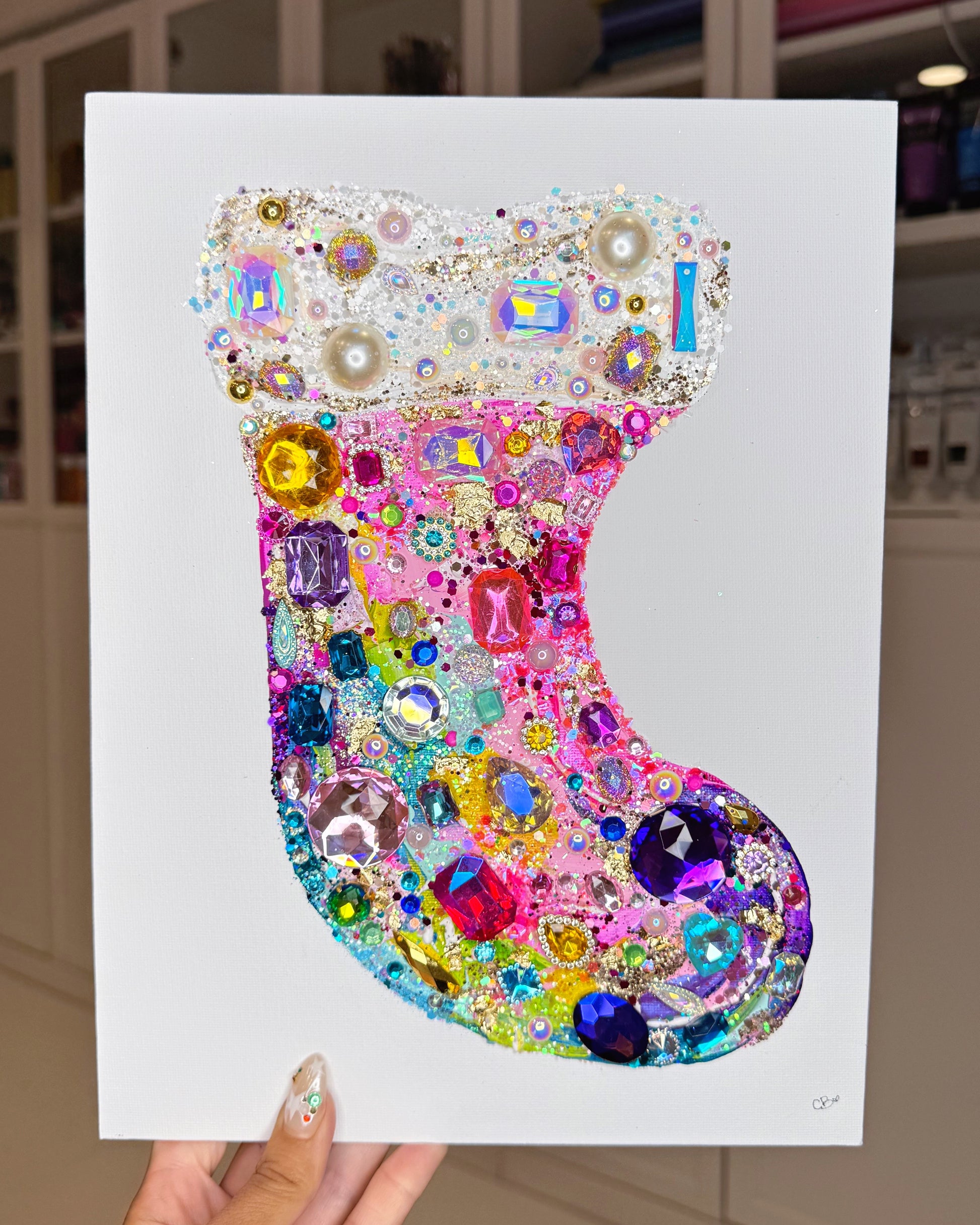 This sparkling jeweled stocking is packed with festive color, shimmer, and texture. Covered in rainbow gems, pearls, and hand-painted details, it catches the light beautifully and brings a bold pop of Christmas magic to any space. These jeweled pieces go viral on TikTok and Instagram every year!