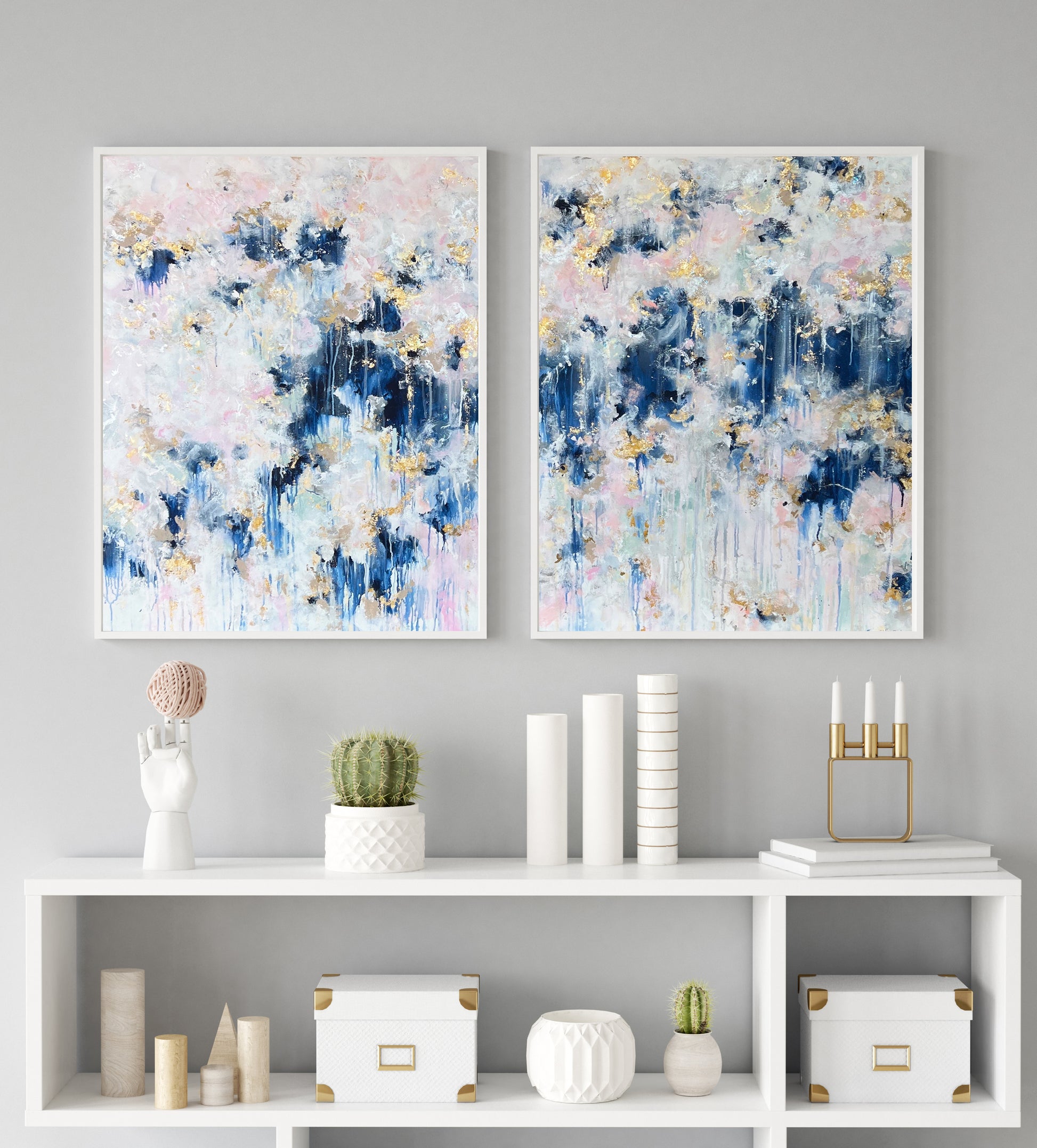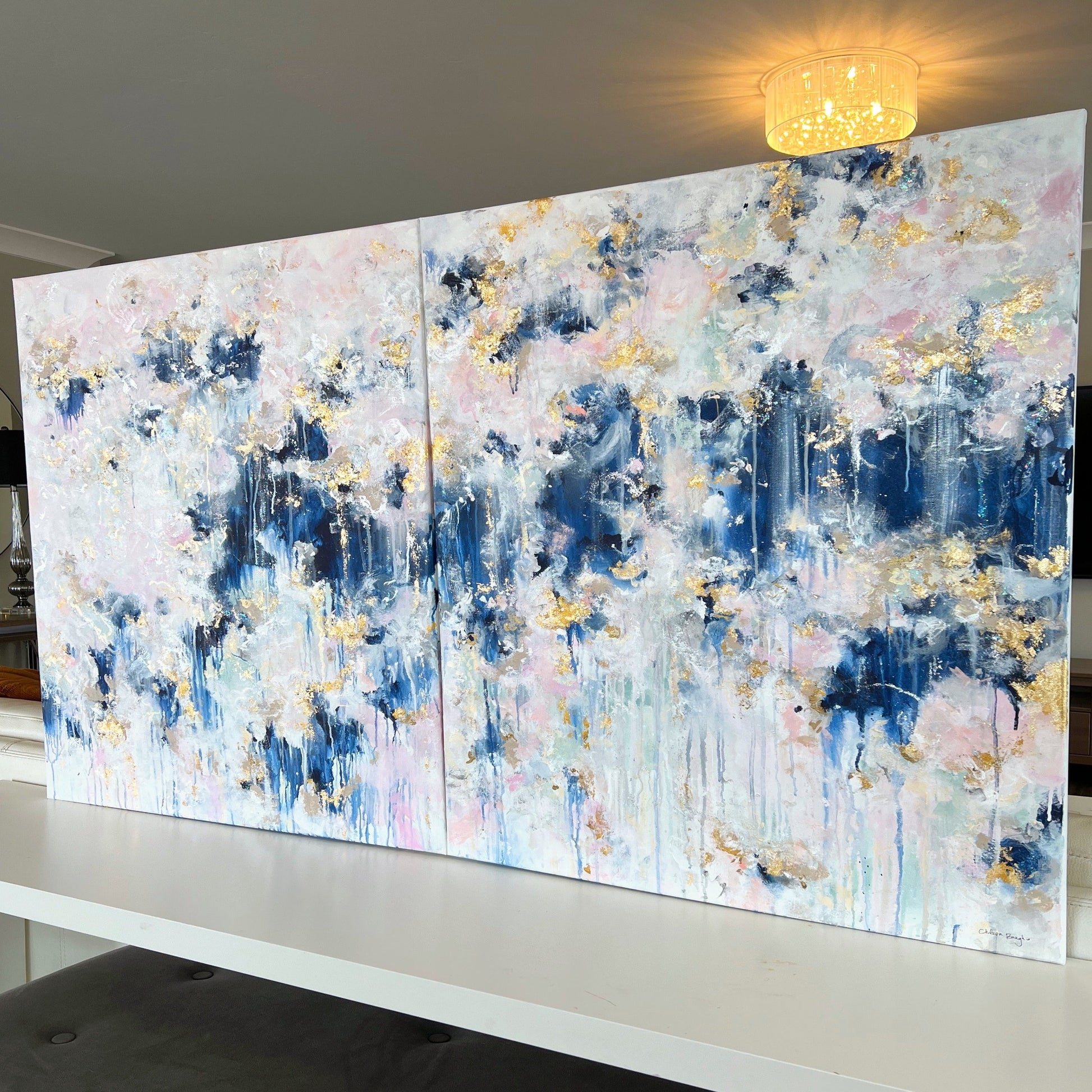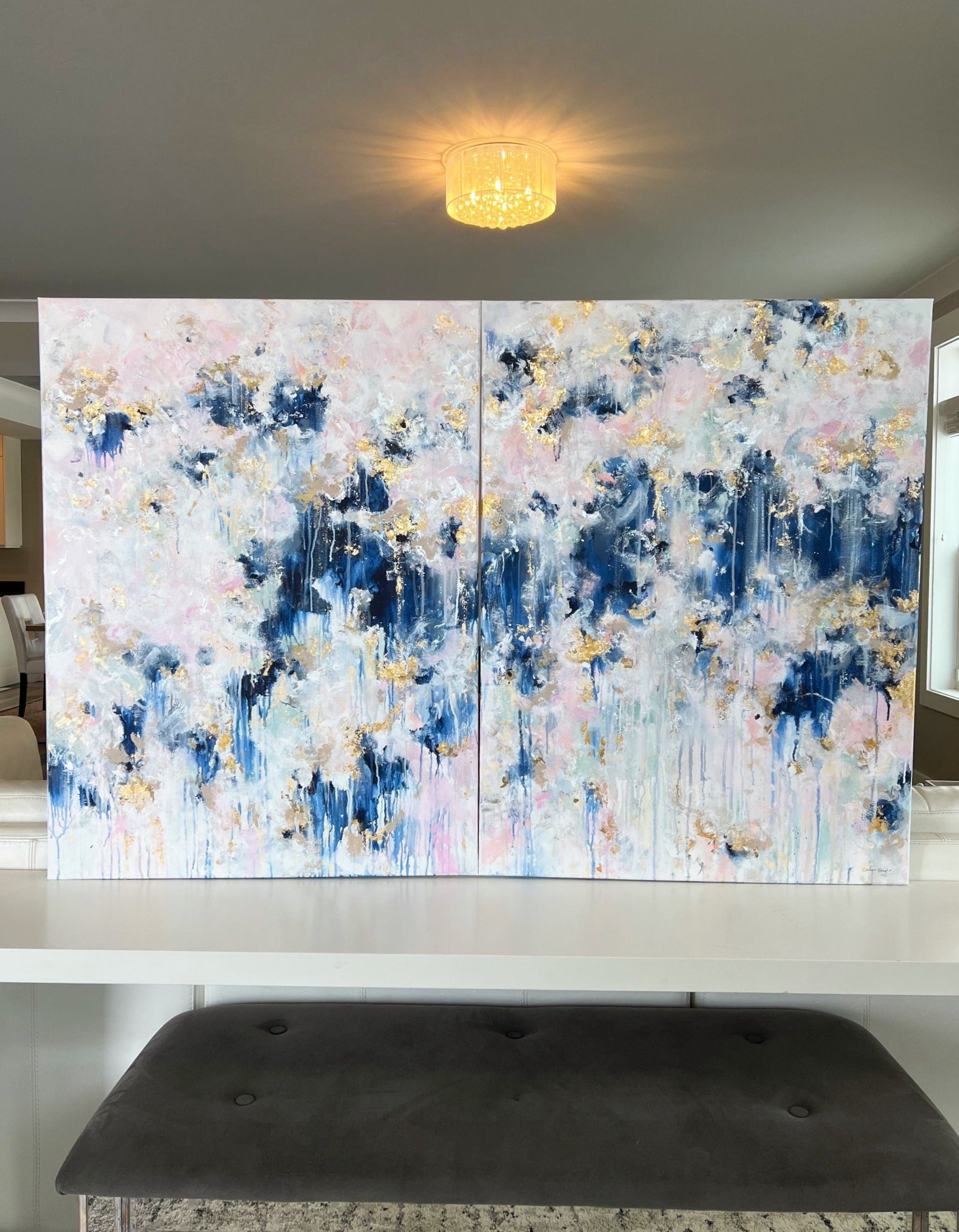Our favorite painting is back! I couldn't resist not redoing this fun painting. The Ellie is an acrylic painting that is popular because of its versatility and color combination. Whether you want to place it in your studio, your kitchen, your living room, or your mudroom, the Ellie will soon become your most treasured art piece. Painted with a blend of light pinks, navy blue, and accented with gold leafing 'The Ellie' will be cherished in any room it is placed in and will add joy and light to your space.